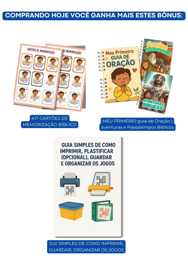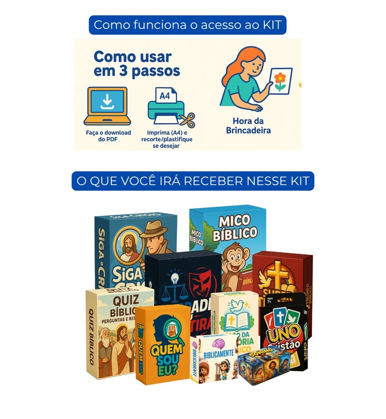 Turma da Fé Kids — Kit 20 Jogos Cristão é um pacote em PDF com 20 atividades prontas (cartas, cartelas, jogos de tabuleiro simples, quizzes e mai), pensadas para mães ocupadas.